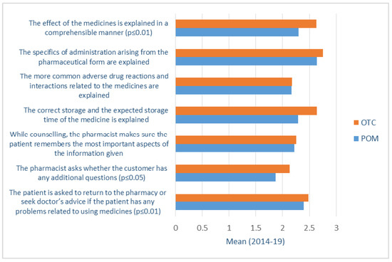 Analysis of traditional community pharmacy services revealed no significant changes in counselling practices of both prescription-only medicines (POM) and over-the-counter (OTC) medicines during the study period. To some extent, the counselling quality was higher for OTC medicines and lower for POM medicines (Figure 2). However, this difference cannot be directly related to the implementation of the CPSQG; as there were no significant changes in counselling quality provided in the two groups of medicines mentioned above within the years the study was undertaken. The most concerning result was insufficient risk communication (adverse drug reactions, interactions, and contraindications) to patients with POMs (2014-19 Tukey p = 0.015) and OTCs (2014-19 Tukey p = 0.038), also with a decreasing trend from 2014 to 2019. Besides, compared to the first study year, the consultation about different medical devices (e.g., inhalators) has decreased in the last two study years (2014-16 Tamhane p < 0.001; 2014-19 Tamhane p = 0.003).