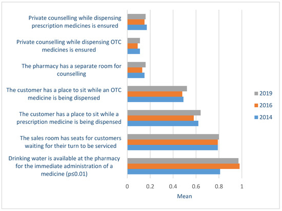 A few pharmacies (in 2019 16%) in Estonia have a separate consultation room or private counselling possibilities in the sales area for POM and OTC medicines. This situation did not change during the study period. On the other hand, many pharmacies provided customers with a seating area and drinking water to administer the medicine (2014-16 Tamhane p < 0.001; 2014-19 Tamhane p < 0.001) (Figure 4).