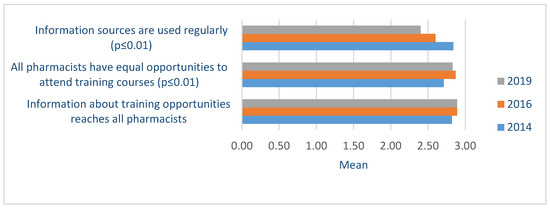 | Pharmacists’ lifelong learning (6) | Information about training opportunities reaches all pharmacists. | 4 | 2.82 ±0.43 | 2.89 ±0.32 | 2.89 ±0.34 | 2.86 ±0.37 | 0.121 |