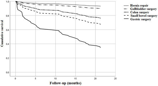 We performed a descriptive analysis of all data collected, and results were expressed as absolute numbers, percentages, and mean ± SD. Univariate analysis was carried out for detecting the difference between survivors and deceased subjects; based on type of data, statistical analysis was conducted with Chi-square test for detecting difference in frequencies, and with Student t-test, and Mann–Whitney test for detecting differences between normally distributed data or non-normally distributed ones, respectively. Surgery was analysed as laparoscopic or open abdominal procedures and accounting for organ or apparatus involved. Therefore, we considered colon, small bowel, gallbladder, gastric surgery, hernia repair, and appendectomy. We classified as other, different types of abdominal surgery. Taking into consideration comorbidity, population was stratified in two groups, based on the median values of CCI. Survival after different types of surgery and of patients with CCI< or ≥median value was estimated by Kaplan–Meier curves. Cox regression analysis for hazard ratios (HR) calculation was performed, age, sex, and CCI were the independent variables. The survival analysis was performed using the Kaplan–Meier method with the log-rank test. All p-values were two-tailed, with significance defined as p < 0.05. Statistical analysis was performed using IBM SPSS Statistics version 26 (IBM Corp., Armonk, NY, USA).
