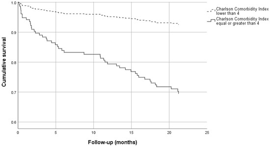 Finally, cerebrovascular disease was marginally higher in deceased group. Cox regression analysis showed that CCI (Hazard Ratio 1.132, 95% Confidence interval 1.009–1.270, p = 0.035), and open surgery (Hazard Ratio 10.298, 95% Confidence interval 1.409–75.285, p = 0.022) were independently associated with all-cause death while age and sex were not (Table 2). Survival of patients with CCI lower than 4 and ≥4 is shown in Figure 2.