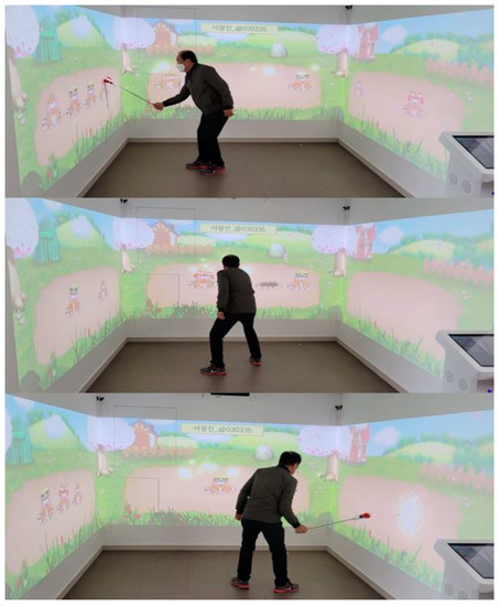 With the advancements in information technology, virtual reality (VR)-based cognitive rehabilitation therapy [8,9] and VR games as resources for helping improve deteriorated functional capacity, have modernized the clinical practice of rehabilitation professionals [10,11]. VR allows users to experience and interact with computer-generated environments and to react as they would in real life when performing predetermined tasks [12]. This method can be used to perform fun and interesting tasks, thus increasing the user’s motivation [13]. VR ranges from non-immersive to immersive, depending on the degree to which users are isolated from the physical environment while interacting with the virtual environment [14]. In particular, immersive and semi-immersive VR systems have provided opportunities for motor or cognitive activities that cannot be implemented in a clinical environment by performing real-life scenarios and simulations of activities [15,16]. VR health applications have been conducted in several studies to address health-related issues in older adults [17]. VR application for older adults should be considered not only for its effectiveness, but also for the side effects of body reactions following VR application and VR acceptance. The use and development of immersive VR using head-mounted display (HMD) is expected to become more realistic and to promote generalization to real-life performance [18]; however, the negative attitudes of elderly users toward HMD VR and cybersickness could hinder this [19]. Semi-immersive VR has higher user immersion than non-immersive VR as it uses real images in a virtual environment and has fewer side effects, such as cybersickness [20]. For this reason, the use of semi-immersive VR in the field of rehabilitation is recommended. Semi-immersive VR has been demonstrated to be an effective intervention for improving balance and gait ability, as well as cognitive function in various subjects, including community-dwelling older adults and patients with neurological disorders [21,22].