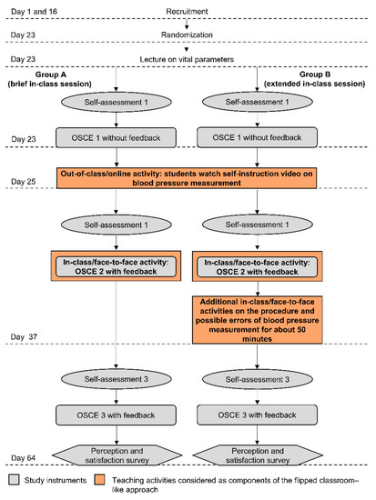 A blending learning approach can be implemented in various formats [22,23,24]. One format to realize blended learning is the flipped classroom [23,25]. The framework of the flipped classroom approach was already introduced in 2000 [26,27] and further developed by Bergmann and Sams [25,28]. Definitions regarding flipped classroom vary [29,30,31,32,33,34]. Jensen et al. describe that in a flipped classroom the students are responsible for content attainment before the class and in-class the instructor guides and facilitates concept application. [33]. Flipped classroom approaches can increase instructor–student interaction [28,35] and they can lead to an increased class time efficiency, as the in-class time is used for more student-centered learning activities [36]. The instructor can spend in-class time to guide students in deeper learning processes [37]. The time efforts for developing such an approach amortize over time because the repertoire of materials may only need to be updated [38,39]. From the students’ perspective, students might consider the assigned preparing material for the out-of-class portion as an extra burden [36,40]. The literature indicates the beneficial effect of flipped classroom approaches on blood pressure measurement skills [41,42]. Moreover, flipped classroom approaches have been found to improve outcomes in examination scores and course grades in various other disciplines and skills [35,43,44,45]. However, there is no universal flipped classroom approach [46]. Furthermore, it appears that the design of the flipped classroom influences the differences in the effect of the flipped classroom dependent on the learning domain and learning objective [47,48,49]. Therefore, research evaluating which elements contribute to the efficacy of a flipped classroom approach is needed. [49] However, there is a shortage of comparative studies on the adequate extent or elements of in-class activities of a blended learning approach in a flipped classroom setting for practical clinical skills.