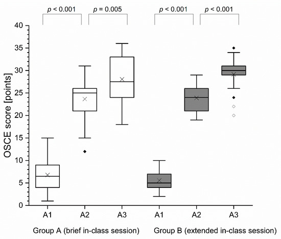 OSCE score per group. Black cross mark (×) = mean; horizontal line = median; black diamond (♦) = outlier; white diamond (♢) = extreme value; OSCE = objective structured clinical examination; A1 = assessment 1; A2 = assessment 2; A3 = assessment 3.