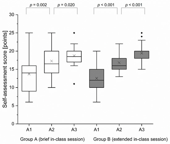 Self-assessment score per group. Black cross mark (×) = mean; horizontal line = median; black diamond (♦) = outlier; A1 = assessment 1; A2 = assessment 2; A3 = assessment 3.