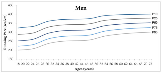 Running is an affordable and easily accessible sport, requiring not much expense regarding the necessity of equipment acquisition. The increase in the number of road runners and running events have been highlighted during the last two decades at an international level [26]. The present study aimed to establish sex-specific percentile curves and values for running pace for non-professional Brazilian road runners, taking into account age, sex, and race distance. Findings of the present study showed that (1) among male runners, the beginning of their thirties and the end of their forties seem to be the moments with substantial improvements in their running performance; (2) among female runners, this improvement phase was observed to be more pronounced toward the end of their forties; and (3) women presented slower running pace than men, in all age-groups.