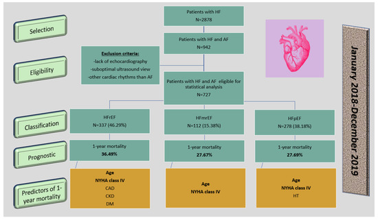 - Son, M.K.; Park, J.J.; Lim, N.K.; Kim, W.H.; Choi, D.J. impact of atrial fibrillation in patients with heart failure and reduced, mid-range or preserved ejection fraction. Heart 2020, 106, 1160–1168. [Google Scholar] [CrossRef] [PubMed]