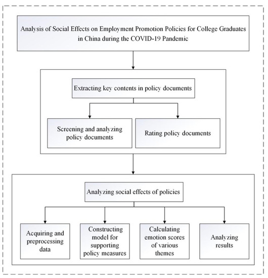 First, this paper collected employment promotion policy documents for college graduates released by the Chinese government during the COVID-19, conducted word frequency analysis, and rated the collected policy by PMC index model to select and summarize important policy measures. Then, related topics of 4 kinds of policy measures were searched, Weibo comments were trawled, and an evaluation model of support degree of policy measures was constructed to evaluate and analyze the public support degree of policy measures, so as to study the social implementation effect of employment promotion policy for college graduates. The framework of the paper is shown in Figure 1.
