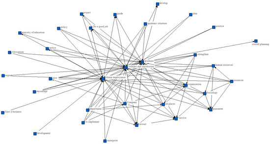It can be seen from the keyword frequency distribution and keyword co-citation networks of the aforementioned policy documents that “employment”, “service”, and “position” rank first among the high-frequency words. This is different from the previous situation for college graduates. The COVID-19 has led universities and companies to cancel offline job fairs for the class of 2020, which are the main job opportunities for fresh graduates. Therefore, during COVID-19, the most important thing for the government is to mobilize all units to implement online employment services, expand employment channels and increase employment opportunities. From the two high-frequency words “entrepreneurship” and “grass-roots level”, we can see that in order to increase the employment opportunities of college graduates, the government has repeatedly mentioned encouraging, supporting and guiding graduates to find jobs at the grass-roots level, stabilizing the environment for innovation and entrepreneurship, and giving full play to the important role of “mass entrepreneurship and innovation” in supporting employment.