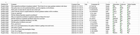 This paper trawls the related Weibo comments on 15 topics. The trawled content includes the publisher ID, the content of the comment, comment time, commenter ID, the number of followers, the number of subscribers, and Weibo number. This paper uses python to obtain a total of 65,487 posts, including 9596 posts for channel measures topics, 17,003 posts for transference measures topics, 7671 posts for subsidy measures topics, and 28,849 posts for position measures topics. The data format is shown in Figure 3.
