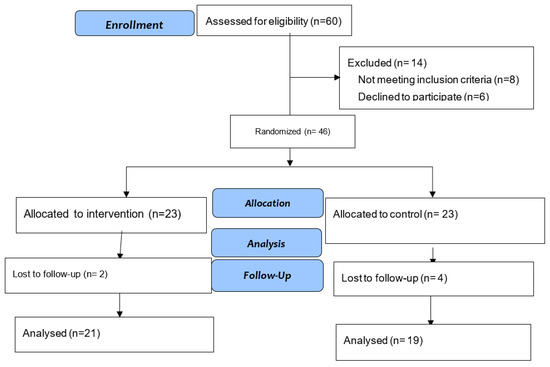 Of the 60 assessed, 46 (76.67%) were included in the study, and 40 (66.67%) completed the study. Statistics was performed per protocol. Figure 1 shows the flow chart.