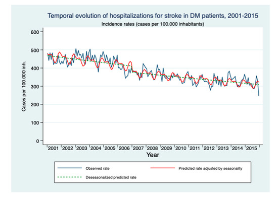 Modeling of the temporal evolution of the stroke hospitalization rate in people over 18 years with DM in the period 2001–2015.