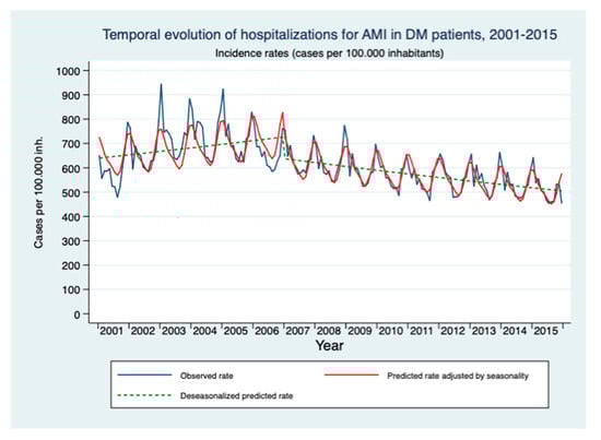 Modeling of the temporal evolution of the hospitalization rate for initial care for an episode of AMI in people over 18 years of age with DM in the period 2001–2015.