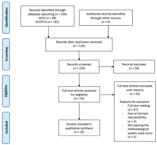 The initial search in the databases gathered a total of 259 articles, 98 from Web of Science (WOS) and 161 from Scopus.