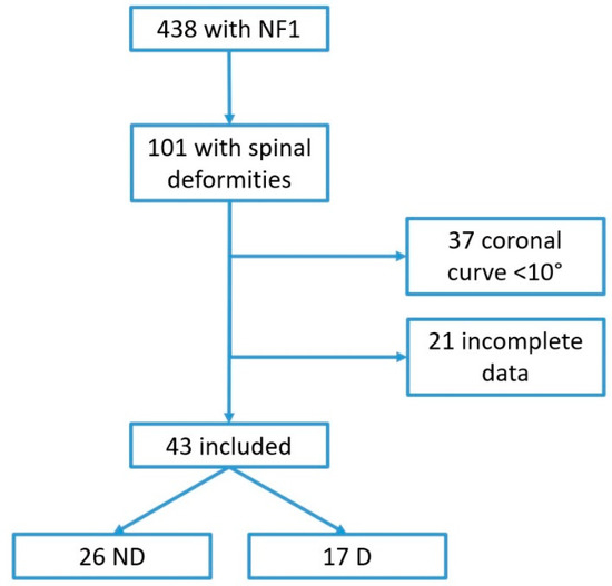 Among 438 clinical reports reviewed, we identified 101 NF1 children (0–18 years) with a spinal deformity. A total of 43 patients were included (24 males, 19 females; M:F = 1.3:1) (see Figure 1), accounting for 9.8% of the entire pediatric cohort. MRI was performed in 22/43 patients to complete the diagnosis of dystrophic scoliosis that was reported in five cases. Table 2 summarizes all data collected for both dystrophic and non-dystrophic groups.