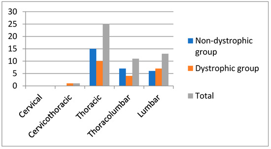 A total of 18 patients (11 non-dystrophic, 7 dystrophic) of the entire cohort were conservatively treated using a brace, whereas 9 required surgery (4 non-dystrophic, 5 dystrophic) (Table 2).