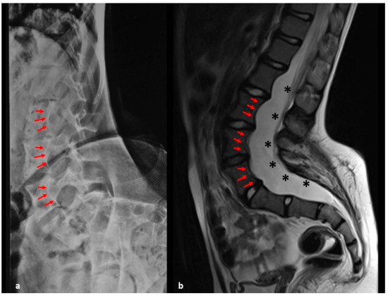 X-ray (a) and MRI (b) of the lumbar spine of a child (F) with NF1 and dystrophic scoliosis. Note the vertebral scalloping (arrows) and the dural ectasia (asterisks).