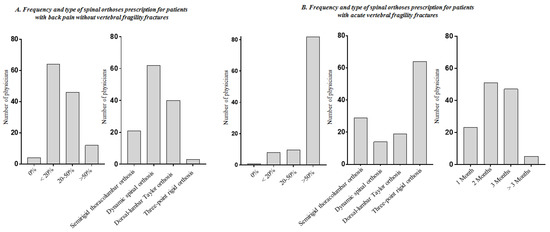 Sixty-four PRM physicians (50.8%) reported to prescribe spinal orthoses in less than 20% of cases of patients affected by back pain without VFFs, with a high variability in terms of orthosis type. Dynamic spinal orthosis was the most frequently prescribed by PRM physicians (62 cases, 49.2%). Figure 1A described further details. On the other hand, a high rate of spinal orthoses prescription was found in patients affected by VFFs, and 83.9% of PRM specialists prescribed spinal orthoses in more than 50% of VFFs patients. The most prescribed spinal orthosis in the common clinical practice was the three-point rigid orthosis (n = 64; 50.8%), followed by the semi-rigid thoraco-lumbar orthosis (n = 20; 15.9%). A discrete heterogeneity has been found concerning the timing for discontinuance of wearing the orthosis in patients with acute VFFs. Twenty-three PRM physicians (18.2%) recommended discontinuance of the spinal orthosis after 1 month, 51 (40.5%) after 2 months, 47 (37.3%) after 3 months, and 5 (4.0%) after more than 3 months (see Figure 1B for further details).