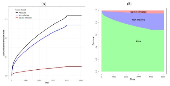 Figure 1 presents the cumulative incidences of deaths from severe infection and non-infective diseases as well as the survival probability of the TSV11 cohort by cause of death. The sum of the cumulative incidences of severe infection and non-infective deaths equals the cumulative incidence of all-cause mortality (Figure 1A). The cumulative incidence of non-infective death exceeds that of severe infection throughout the study period. In Figure 1B, we present the Kaplan-Meier estimate of the survival function for the study cohort. The green area showed the probability of being alive, while the remaining areas were partitioned into death due to severe infection and non-infective disease. Overall, the probability of surviving to the end of the study period was 68.1% (95%CI: 67.0–69.2%), for 30 days was 96.3% (95%CI: 96.2–96.5%) and for 100 days was 93.7% (95%CI: 93.5–94.0%). The majority (5:1) of deaths were caused by non-infective diseases.