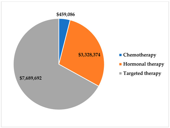 Figure 2 illustrates the major drivers of total spending across all breast cancer stages. Hospital admission and outpatient visits accounted for 5% of total spending, while diagnostic tests, procedures, and radiotherapy accounted for 4%, 3%, and 2%, respectively. This study found that approximately 86% of total costs—$11,477,152 USD in total—were related to the use of medications. Of this, about 73% was spent on treatment of patients with stage IV cancer, followed by 16%, 9%, and 2%, respectively, in descending order of disease stage. Approximately 67% of total spending on medication was associated with targeted therapy drugs, primarily (94%) comprising trastuzumab, either alone or in combination with pertuzumab (Figure 3). Hormonal therapy accounted for 29% of total spend on medications and was mainly (65%) driven by the administration of fulvestrant and letrozole. The use of chemotherapy drugs accounted for 4% of the total spend on medications.