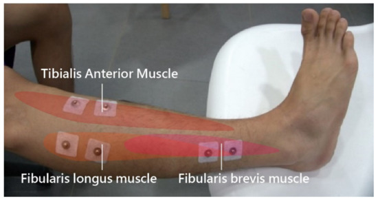 A BioRadio (Great Lakes NeuroTechnologies, Cleveland, Ohio) wireless physiological monitor was used in this study to simultaneously record the electromyographic (EMG) signals of three muscles. Electrodes from the wireless physiological monitor were affixed on the skin surfaces above the tibialis anterior, fibularis longus, and fibularis brevis muscles (Figure 1) on each leg. The BioRadio system was set at 24-bit resolution with sampling frequency of 1000 Hz and an input range of ±0.187 V, which was and filtered (high-pass Butterworth, 60 Hz) during acquisition. The monitor was connected to BioCapture on a computer to capture the muscle reaction time to events, such as a tilting process to simulate sudden events, including accidents. This procedure was conducted 12 times each for the dominant and non-dominant foot.