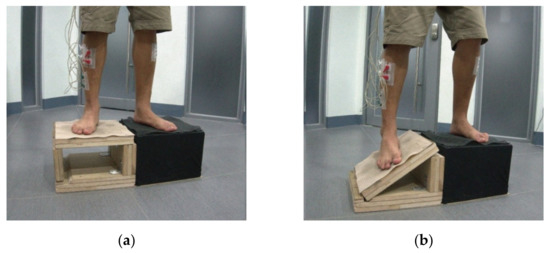 To simulate events that lead to ankle sprain, a tilting platform made of wooden boards was constructed for this study, in which the top board (the platform surface) was supported by two boards (Figure 3a). Tilting of the platform by 30° was brought about by removing the outer supporting board (Figure 3b) for both the right and left foot.