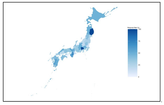 Of the 725 questionnaires sent out, 302 were returned. The response rate was 41.7%. We excluded 20 responses (6.6% of the responses), as 7 units focused on pediatric patients and 11 were ineligible. Two surveys were excluded as one was not filled out by a predefined person, whereas another contained invalid answers. Consequently, 282 responses from ICUs were analyzed. Concerning geographical distribution, Figure 1 indicates the proportion of ICUs, by prefecture, that were mailed the study questionnaires and the ICUs that responded.