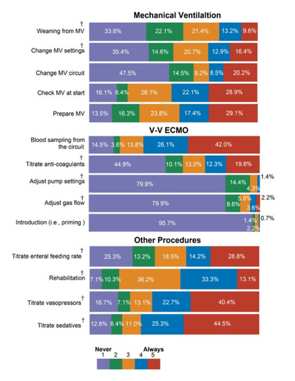 Nursing activities for specific procedures.Note: “Always” means that the nurse always undertook the procedure. “Never” means that the nurse never undertook the procedure and that other professionals, such as physicians, undertook the task. Missing data were included in this analysis. Abbreviations: MV, mechanical ventilator; VV-ECMO, veno-venous extracorporeal membrane oxygenation; † under a pre-prescribed protocol.