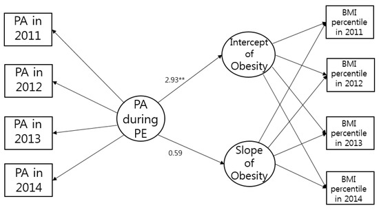 The aim of this study was to examine the effect of PA during PE on the obesity status of South Korean adolescents over time. Based on the final model proposed in this study, PA was significantly associated with initial obesity status. However, a longitudinal effect of PA was not identified.