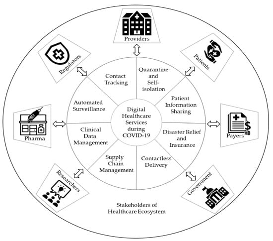 Figure 1 illustrates a representation of a complex healthcare ecosystem with multiple stakeholders who constantly integrate, interrelate, and interoperate with digital technologies during pandemic situations. The key stakeholders of the healthcare ecosystem are described below: