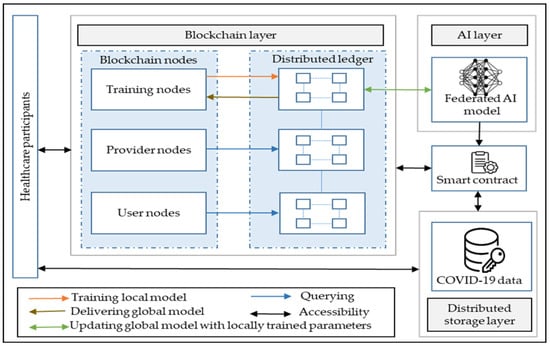 The blockchain layer consists of provider nodes, user nodes, and training nodes. The provider node includes participants, such as hospitals, clinics, or healthcare organizations, to store and update every patient information (name, patient’s unique ID, prescribed medicines, and discharge summaries) in the blockchain ledger. Furthermore, provider nodes assign ownership to the patient medical data in the on-chain blockchain distributed ledger, as well as store coronavirus-related electronic health records, such as CT scans, chest X-rays, and medical reports, in off-chain decentralized storage networks. The user node consists of patients who manage and control their coronavirus-related datasets on blockchain platforms. This operation can be achieved by implementing an Ethereum-based smart contract protocol, such as patient-centric access control (PCAC-SC), to enable a distributed and trustworthy access control policy []. The smart contract ensures access to the control and safety of patient-sensitive data without using a centralized infrastructure. The participants in the patient-centric healthcare ecosystem are synchronized with the provider blockchain network to share communications between them regarding accessing the patient data for establishing pandemic management and response strategies. The patient-centric approach allows patients to protect and give access to COVID-19 data based upon the healthcare entities’ requests. The blockchain-based, patient-centric framework could offer a number of feasible solutions for coronavirus-related services and applications with improved interoperability among different healthcare platforms, such as insurance claims, pharmaceutical needs, hospital databases, supply chains, and clinical data management.
