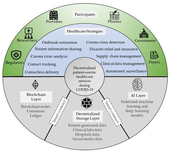The novel coronavirus disease (COVID-19) has spread to almost every country since the outbreak in December 2019 from Wuhan, China. The severity of this epidemic became extensive within a month of the virus’s widescale spread. Thus, a Public Health Emergency of International Concern (PHEIC) was declared by the World Health Organization (WHO) []. The outbreak forced several nations to close their borders, maintain lockdowns, and practice social distancing to limit the spread of COVID-19. These led to massive interruptions in the economy of many sectors, such as industry, insurance, agriculture, supply chains, transport, and tourism []. The pandemic has had an unexpected impact at the global level, not just on an economic scale, but also pushing healthcare systems around the world to their limits, such as through a lack of personal protective equipment (PPE) for healthcare workers and by causing difficulties in diagnosing and monitoring large populations []. In general, the healthcare system has operated in a closed ecosystem of siloed institutions, where healthcare professionals (i.e., doctors, radiologists, clinicians, and researchers) have served as the primary stakeholders of medical information. The flow of information has gone in one direction, i.e., healthcare expert to patient. However, in the era of digitized patient health records, data are growing and flowing across a closed healthcare system faster than ever before. The one-to-one flow of information is giving way to a multiplicity of information, sharing relationships with many-to-many, one-to-many, and many-to-one []. In such cases, most coronavirus information collected from the public, hospitals, and clinical laboratories may not be faithful, since the data are not gathered according to set guidelines [] and are not monitored or stored appropriately because of the vastness of digitized patient health records. The existing healthcare technology requires trustable data, which is crucial to providing the correct widespread information about the novel coronavirus. Furthermore, the virus test procedure using medical tools for detecting coronavirus infections often takes several days to complete because of the inaccuracy and manual processing of large volumes of data. Finally, tracking or surveilling infected patients or their contacts raises several privacy issues []. These insufficiencies exposed by COVID-19 have prompted healthcare organizations to transform the existing digital healthcare system to combat pandemic situations. Overall, the digital healthcare ecosystem needs to facilitate clinical trials, frontline care, data surveillance, medical billing, telemedicine, drug delivery, treatment facilities, and strategy discovery. In addition, it is essential to design a more patient-centric and democratized digital healthcare ecosystem for combating COVID-19 and future pandemics by using digital platforms.