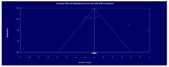 A meta-analysis was performed using Comprehensive Meta-analysis Version 3.0 statistical software (Biostact, Inc, Englewood, United States of America). The difference in means was calculated based on information on the pre- and post-intervention means, the number of participants, and the standard deviation, using the randomized effects model to measure the effect size, with a 95% confidence interval (CI), magnitude effects, and level of statistical significance (p < 0.05). Heterogeneity was assessed using the chi-square, Cochran Q statistic, Higgin I squared (I2), and Tau square tests (T2). The homogeneity was verified by the asymmetry of the funnel-shaped scatter plot [38], and it was considered without publication bias when the graph had an inverted funnel [39].