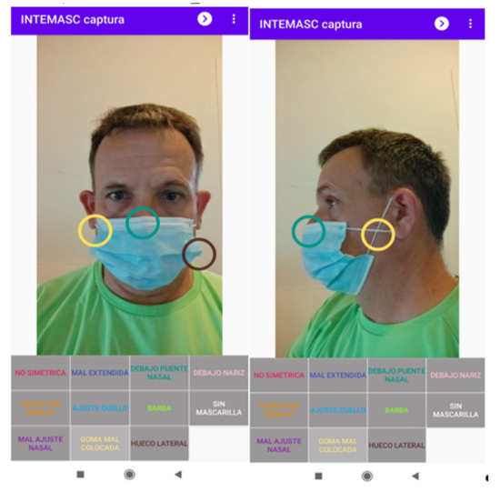 The labeling was carried out by a nursing group from the hospital of Ontinyent. To speed up the work, an Android application was developed that allowed us to label 12 types of problems as well as the location where the problem was evident. Figure 2 shows this application, with an image from the front and another from the side. The labels were: 1—mask incorrectly extended, 2—non-symmetrical placement, 3—incorrectly bent in the nasal part, 4—adjusted below the bridge of the nose, 5—glasses placed under the mask, 6—neck adjustment greater than 1 cm, 7—with a beard, the use of a mask is not recommended, 8—incorrectly placed rubber band, 9—lateral gap greater than 1 cm, 10—exposed nose, 11—without a mask, 12—others.