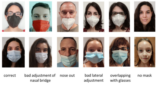 To our knowledge, no studies have been conducted on the identification of different misuses of masks through deep learning. The study carried out from [29,30,31,32] only detected the most obvious error, consisting of wearing the mask under the nose. Our proposal is capable of detecting, in addition to the previous mentioned issue, other types of problems, which occur very frequently. Even many of the users are unaware that they are using the mask incorrectly. However, we have not been able to detect other types of problems, such as (“incorrect lateral adjustment” and “glasses underneath”). For these cases, it is necessary to find an alternative approach or increase the number of training samples.
