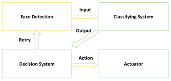 The block diagram of the system is depicted in Figure 4. There are four different actors that constitute our proposal. The first one is the face detection module. This module presents a computer vision solution for face detection in real time. The second one regards classifying. The classifying module receives the input from the face detection module. Then, based on the system explained in the previous section, the classifying stage detects the errors in the facemask placement. The error and situation analysis module is included in third place. This module is an algorithm that evaluates the error given by the classifying system to select the most appropriate action. This is explained later in this section. The actuator module interacts with all the previous ones to create the warning or thanks the person for their correct use of the facemask.