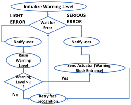 Now, the only module that we need to specify is the decision system. Figure 5 shows the flow diagram of the algorithm. First, the warning level is initialized. Then, the module waits for an output, which is the probability of having a facemask placement error. When the module receives the output from the classifying module, it analyzes the predicted class with the highest probability, that is, the predicted error. Some error classes are more important than others, in which case they will be labeled as serious. For the most important errors, such as no mask detected, the system should ask the user to wear a mask, raise an alert, and block the entrance to the place if necessary. Some other errors are low-risk errors, which can be solved with a warning message to the user. When this happens, the face recognition module has to be started again. However, if there are continuous errors with the mask, due to the fact that the user does not want to wear it correctly, that would be treated as a serious error.