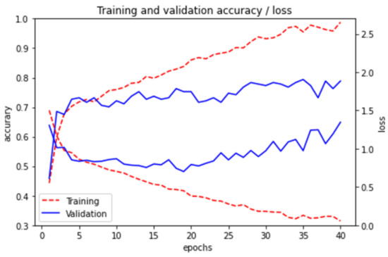 We start by testing a traditional convolutional network. The results are shown in Figure 6. The two upper curves correspond to accuracy and the lower ones to loss. The following four convolutional layers have been used: 32 of 3 × 3, 44 of 5 × 5, 128 of 5 × 5, and 128 of 3 × 3. In each layer max-pooling (2 × 2) and ReLU activation function is used. For classification, 3 dense layers of 512, 256, and 6 neurons are used.