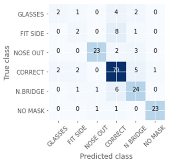 In this case, we can confirm that there is a high accuracy except for in the “GLASSES” and “FIT SIDE” classes. “GLASSES” corresponds to “overlapping with glasses”, “N. BRIDGE” to “bad adjustment of the nasal bridge”, and “FIT SIDE” to “bad lateral adjustment”.