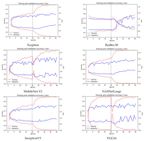 For each of the indicated models, their feature extraction layers have been used. After these, a layer of averagePooling2D is added and two dense layers of 512 and 6 neurons. The training is carried out in two phases. On epochs 1 to 20, the transfer model is locked and only the classification layers are trained. On epochs 21 to 40, fine-tuning is performed, unlocking learning of all the layers. Other configuration details are described in the Training details. Figure 8 shows the evolution of training for each model. The two upper curves correspond to accuracy and the lower ones to loss. The best results are obtained with VGG16. An improvement of 5% is observed for the results obtained with CNN.