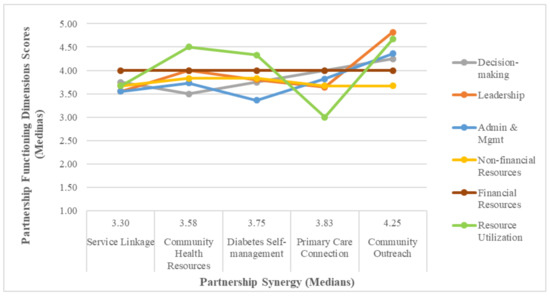 We subsequently analyzed the scores for partnership synergy outcomes, partnership synergy processes and total partnership synergy in each of the five partnerships. Our one-way analysis of variance was suggestive of statistically significant differences between at least two of the medians of partnership synergy processes (p = 0.09) and (total) partnership synergy (p = 0.07). The differences in medians were statistically significant between the following partnerships: Primary Care Connection–Service Linkage, Community Outreach–Community Health Resources, Community Outreach–Diabetes Self-Management and Community Outreach–Service Linkage (in decreasing order of magnitude of difference). No difference was observed when sub-scales were analyzed separately.