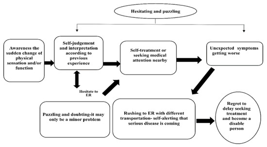 “Hesitating and puzzling” means that the experiences of seeking help and decision-making before arriving at the hospital among the stroke patients who missed receiving rt-PA therapy were due to prehospital delay. Acute ischemic stroke patients in the process were in a state of hesitating and puzzling due to the inability to recognize stroke symptoms. Then, through reasonable self-judgment, these patients addressed issues in a familiar way, but the symptoms did not improve, leading to the results of prehospital delay, as described in the case: