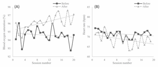 Records of biomedical parameters before and after light therapy intervention from session 0 (baseline) to 20 (post-trial): (A) blood hemoglobin oxygen saturation (%); (B) heart rate—beats per minute (bpm).