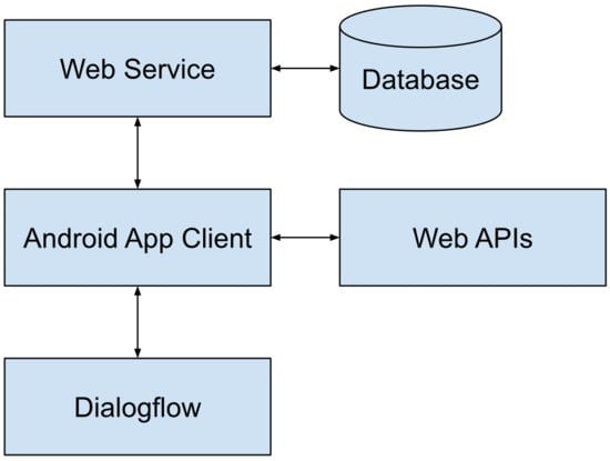 The Android App connects with a web service to exchange information such as user data and statistics that are stored on a database. It also communicates with Dialogflow in order to perform natural language understanding (NLU) from the user’s speech and handle the conversation flow. Other web APIs such as Wikipedia or OpenWeatherMap are also used to receive specific information. It offers a bimodal interface, allowing the user to navigate through the menus or request services either by using the touch screen or by speech using NLU.