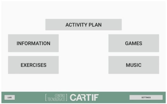 After the user is selected, the proper interaction is started as the robot greets the user. Then, the main menu is shown on the screen, showing the following main categories of the different services available: information, games, exercises and music (Figure 2).