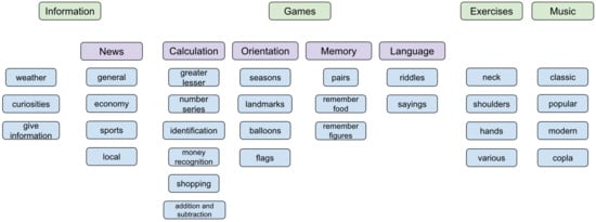 An overview of the services offered by the robot is shown in Figure 3. The offer of services has been chosen to focus on the needs of elderly users; therefore, it has been agreed with the therapists based on their experience and work with them. As one robot is kept permanently in the elder care facility interacting with the users, improvements and new features are continuously being added based on the feedback received using a remote update system integrated in the App, in a continuous process of co-creation.