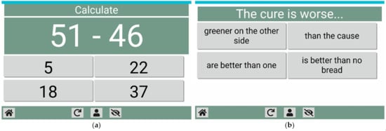Examples of the “addition and subtraction” calculation game (a) and the “sayings” language game (b).