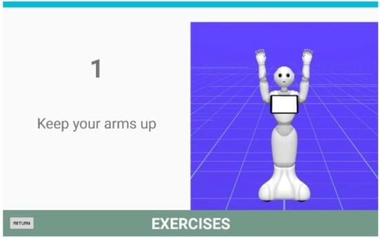 A series of physical exercises have been designed for the elderly and are divided into neck exercises, hand exercises, shoulder or arm exercises and various exercises. To keep the user active and motivated, each group of exercises is performed with background music, the robot explains each exercise aloud and lists each repetition. An example of the robot performing shoulder exercises can be seen in Figure 6.