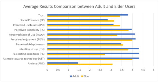 The elderly users showed higher perceived usefulness and slightly higher social presence than adults. The other parameters do not show significant differences between the two groups.