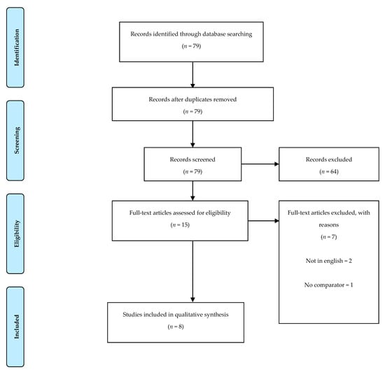The searching of databases identified a total of 79 titles. These studies were then exported to reference manager software (EndNoteTM X9, Clarivate Analytics, Philadelphia, PA, USA). The screening process and the flow to arrive at the included articles can be observed in Figure 1.